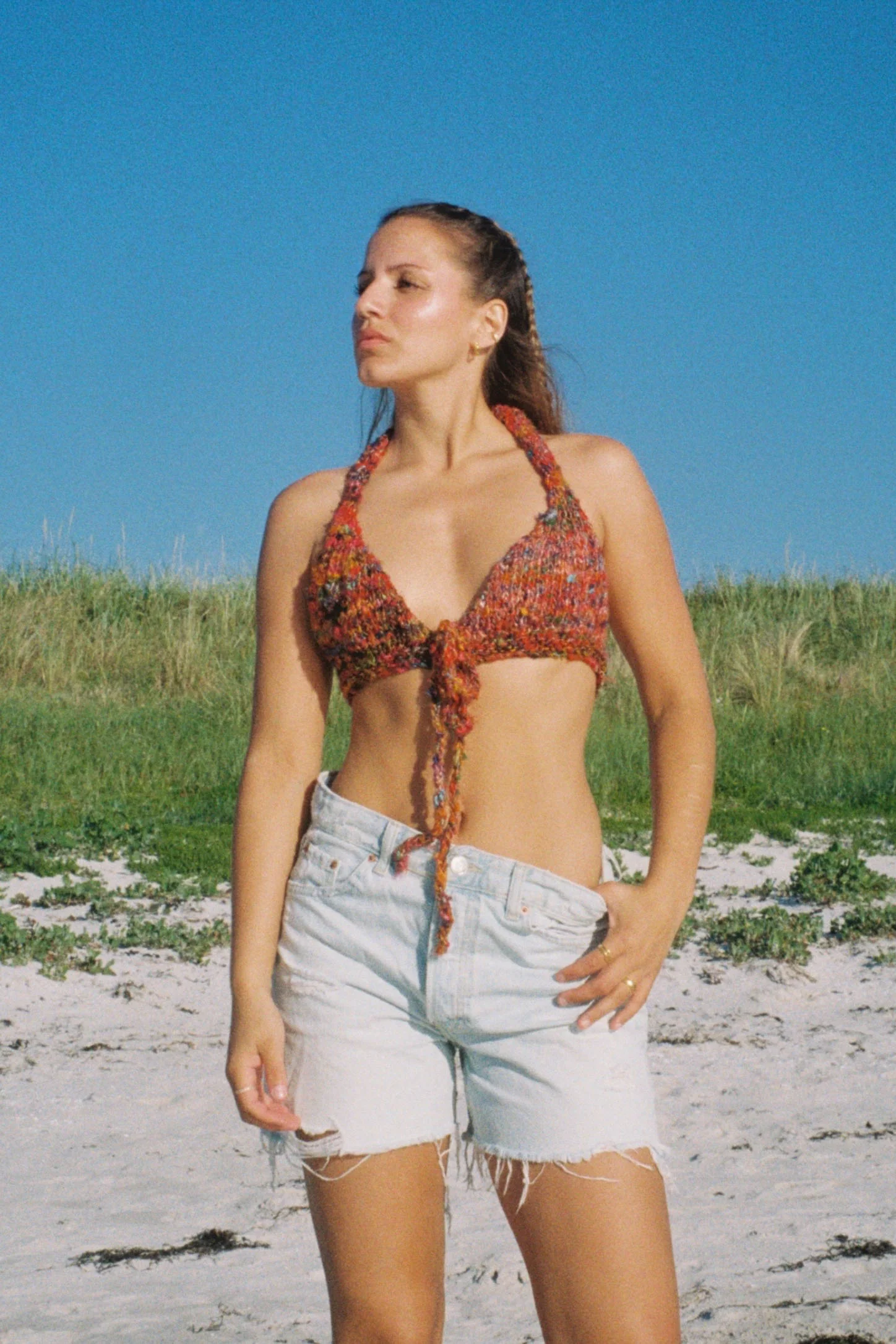 The design showcases a halter neckline and an adjustable tie at the front, back, and neck, which can be worn in a variety of ways.