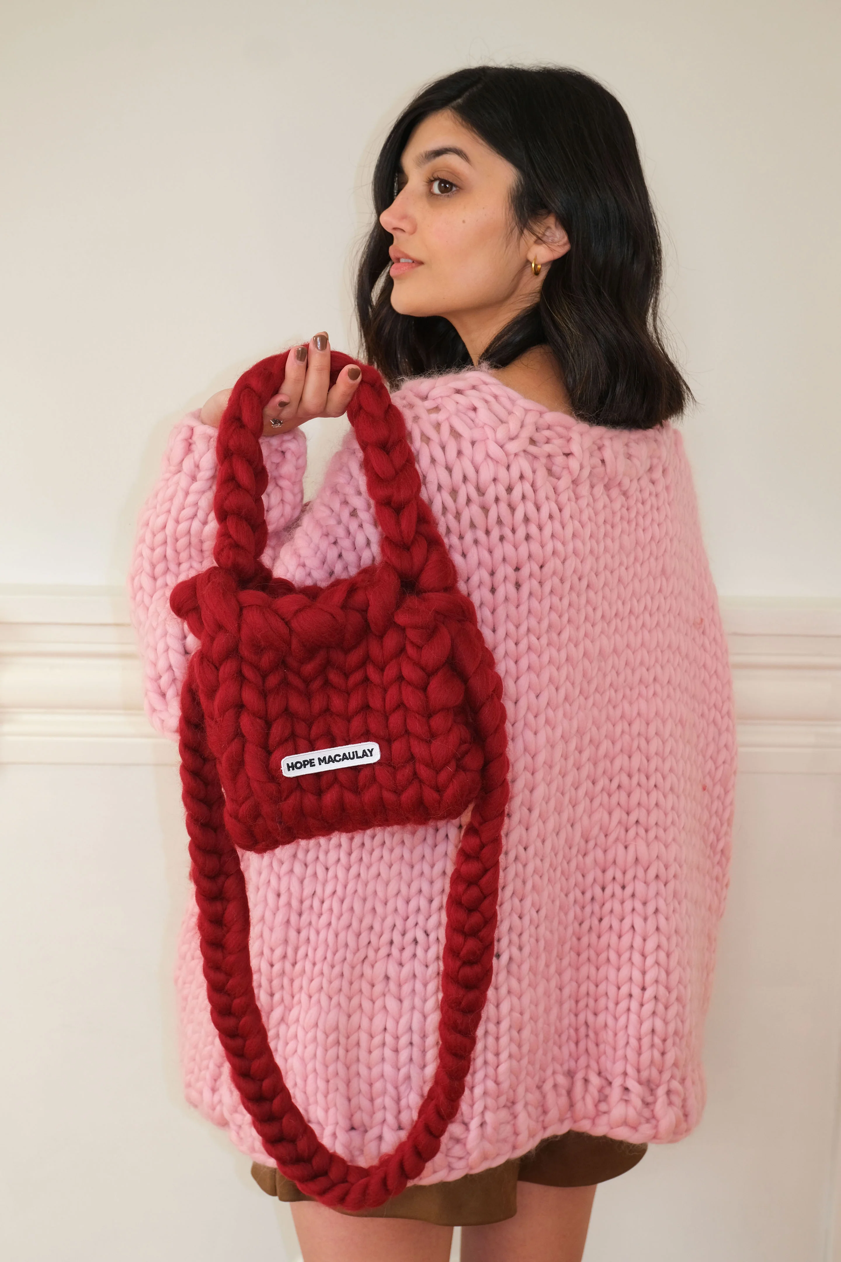 Introducing the Burgundy Colossal Knit Crossbody Bag. A bold statement accessory, designed to add playful charm and texture to any outfit.