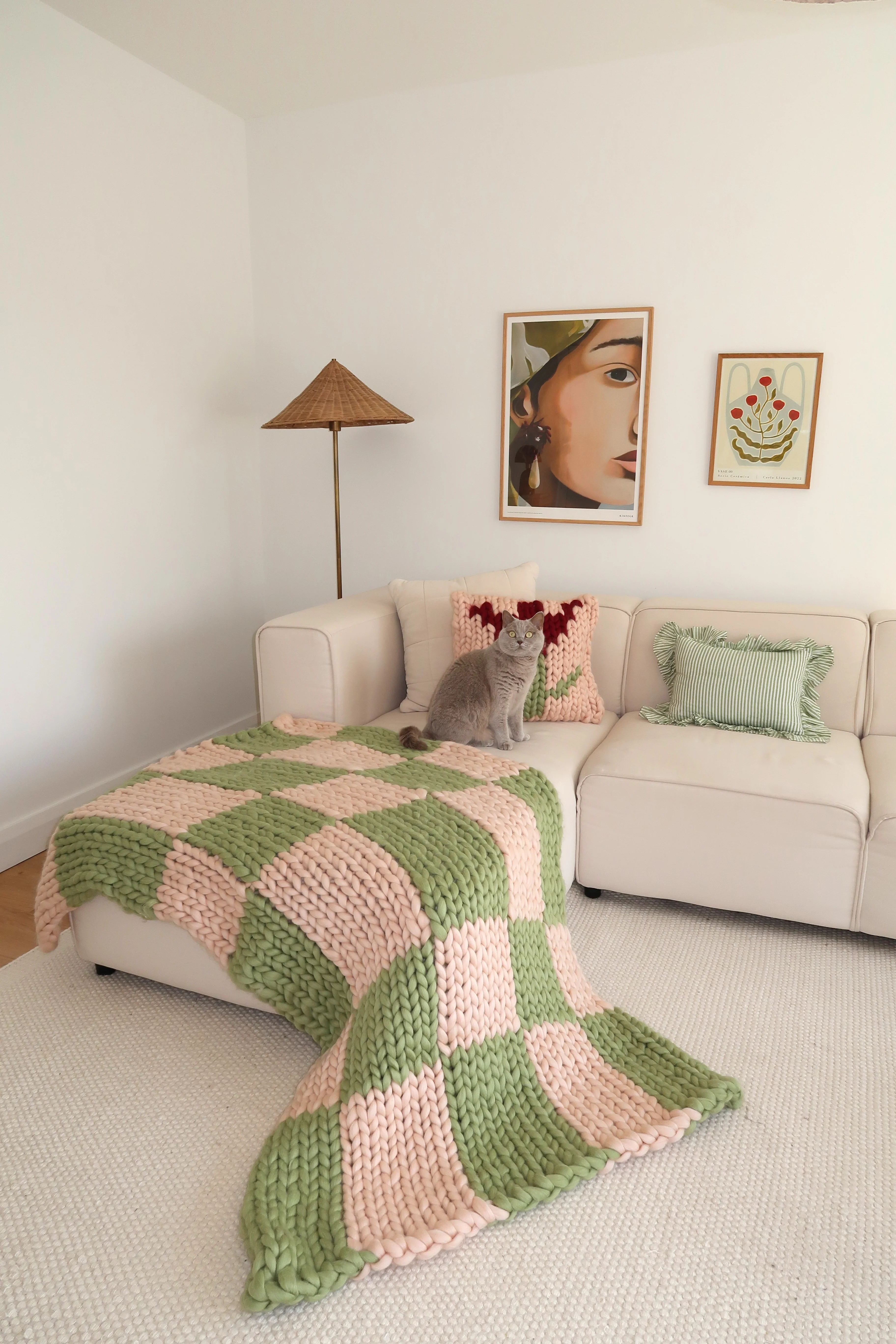 Design details: This luxuriously oversized and delightfully chunky colossal knit blanket features a checkerboard design in sage green and dreamy cream.Â