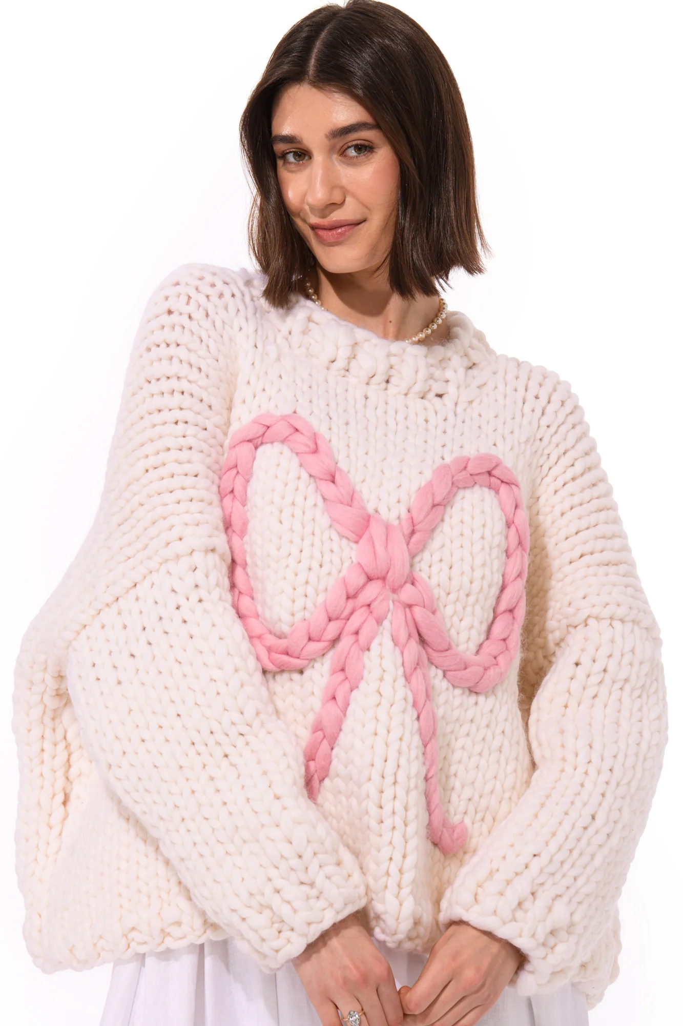 Design details: Our signature chunky knit sweater style, embellished with a large pink bow embellishment.Â
