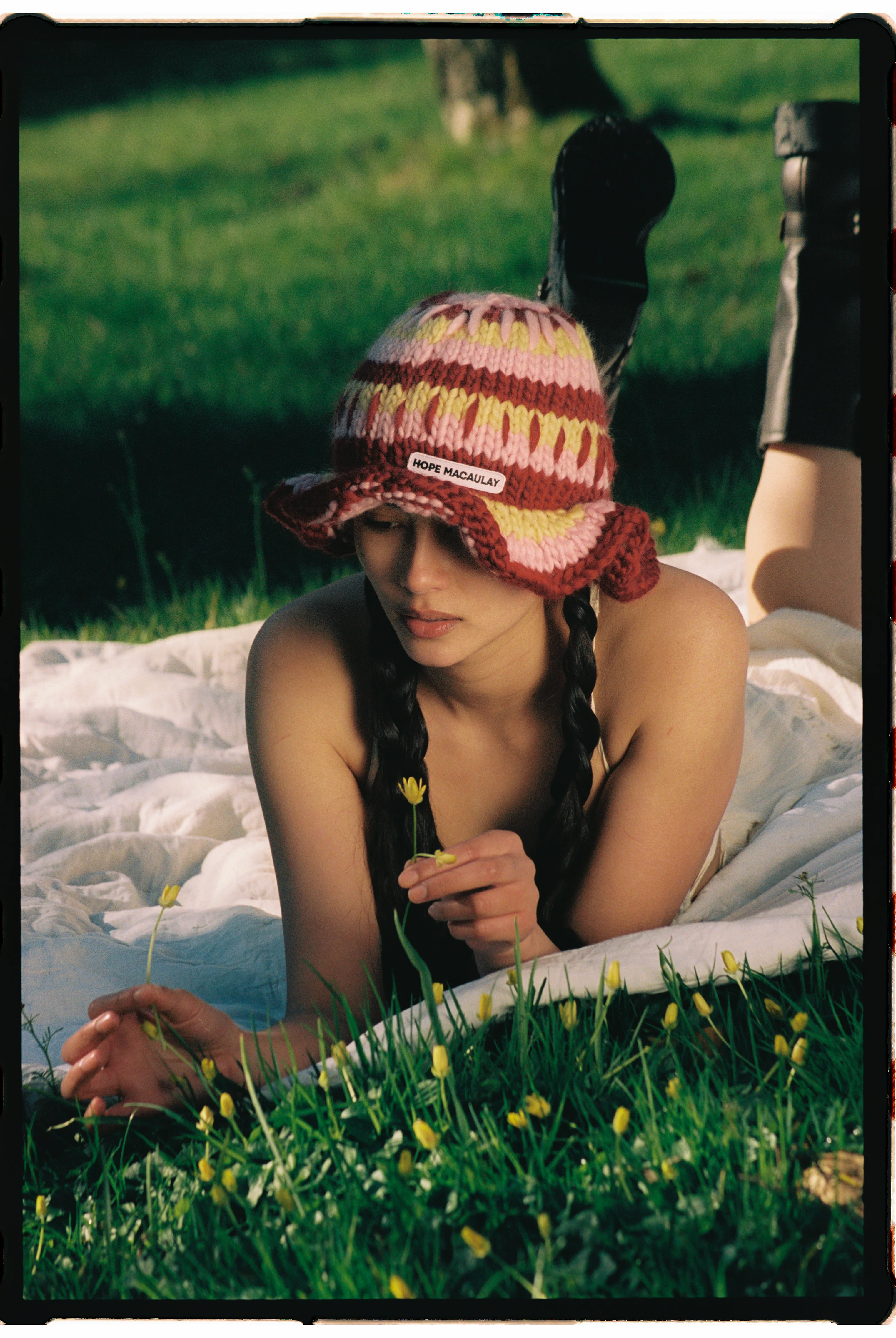 Design details: Bucket hat style featuring chunky knit stripes in burgundy, yellow and baby pink, along with our signature stitching.Â